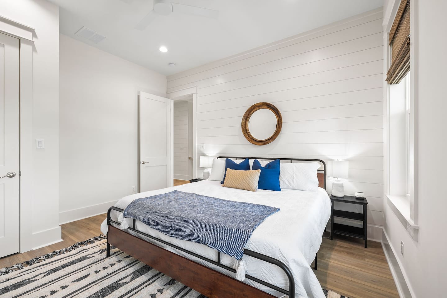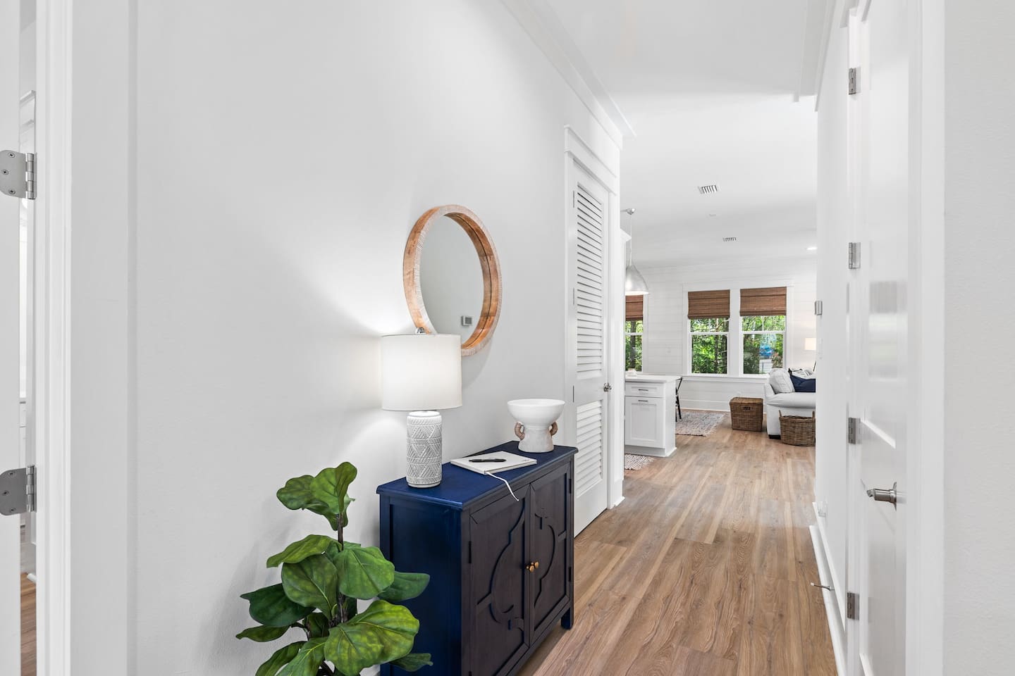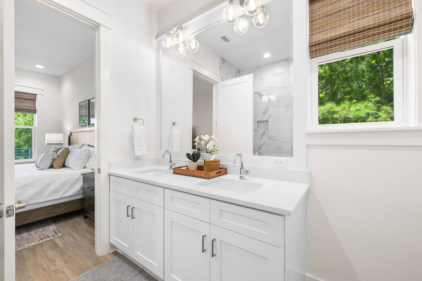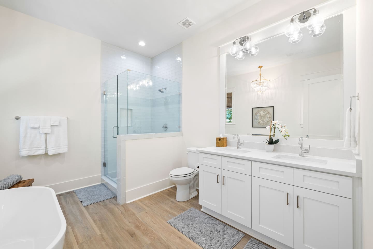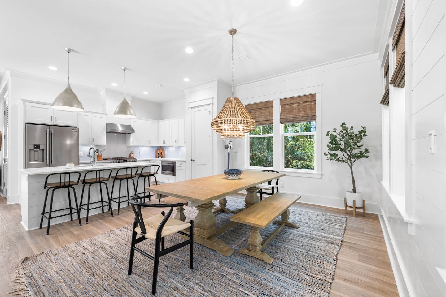 Tucked away on a quiet, tree-lined cul-de-sac, this peaceful retreat is the perfect place to relax and unwind. Our newly built beach home features 5 spacious bedrooms and 4.5 baths, and two separate living/media room areas. On the first floor, you’ll find a primary king suite with a private bath. Upstairs offers another primary king suite with a private bath, an additional king bedroom with a private bath, and a fourth king bedroom that shares a bath. The fifth bedroom is a cozy bunk room with twin-over-twin bunks, sleeping up to four. *Pool heating is available for $50 per day and must be requested prior to arrival.